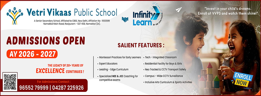 As Vetri Vikaas Public School celebrates two decades of educational excellence, it reflects not only on its remarkable journey but also on the countless lives it has touched and transformed. With a rich history steeped in tradition and a vision set firmly on the future, Vetri Vikaas Public School continues to shine as a beacon of knowledge, enlightenment, and empowerment in Rasipuram and beyond.